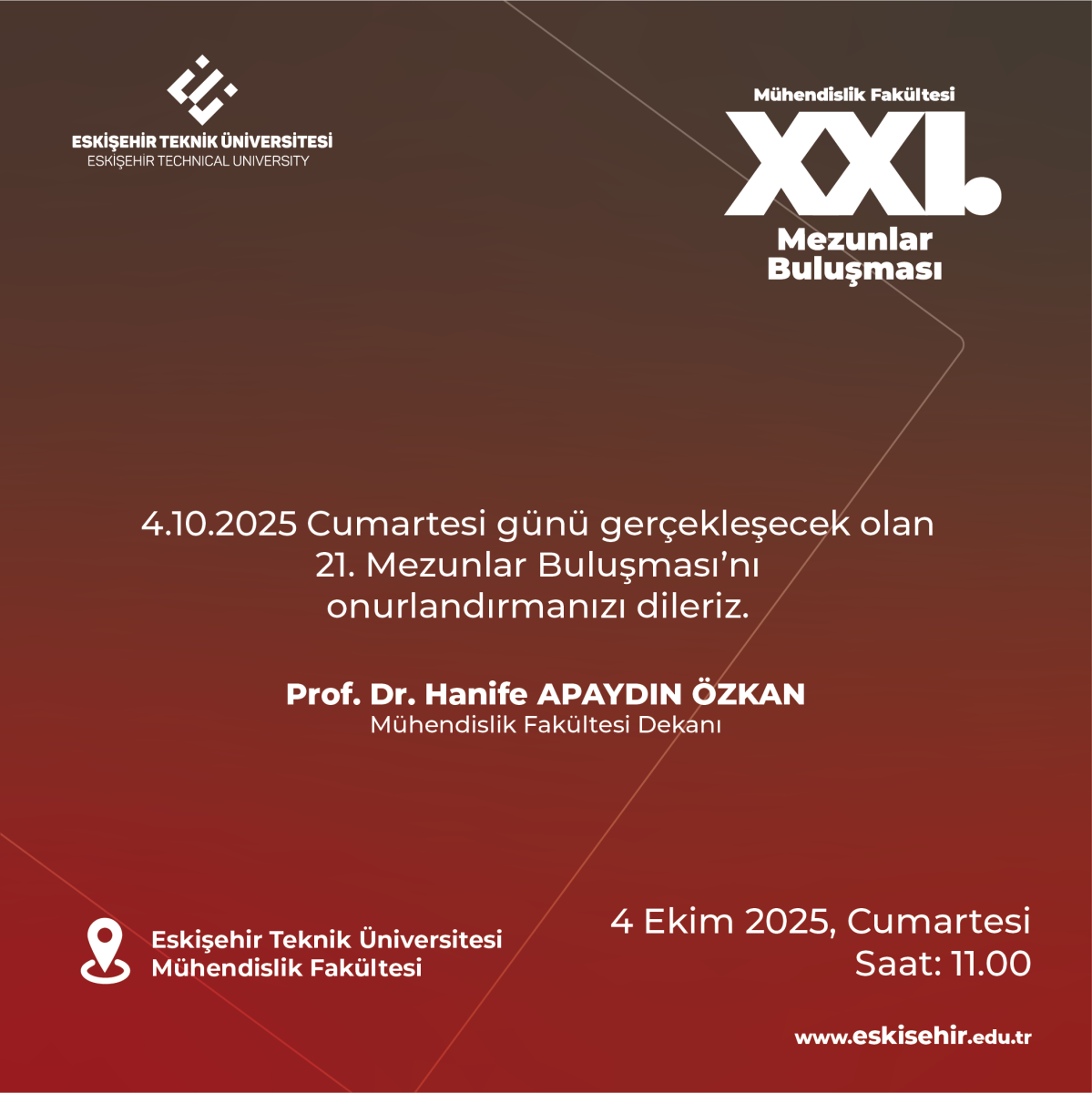 21. Geleneksel Mezunlar Günü Buluşmamız 4 Ekim 2025 Cumartesi Günü saat 11:00'de Fakültemizde gerçekleştirilecektir. Bu özel günde, üniversitemizden mezun olan siz değerli mühendislerimizle bir araya gelerek, başarılarınızı paylaşmak ve geçmişe güzel bir yolculuk yapmaktan mutluluk duyacağız.