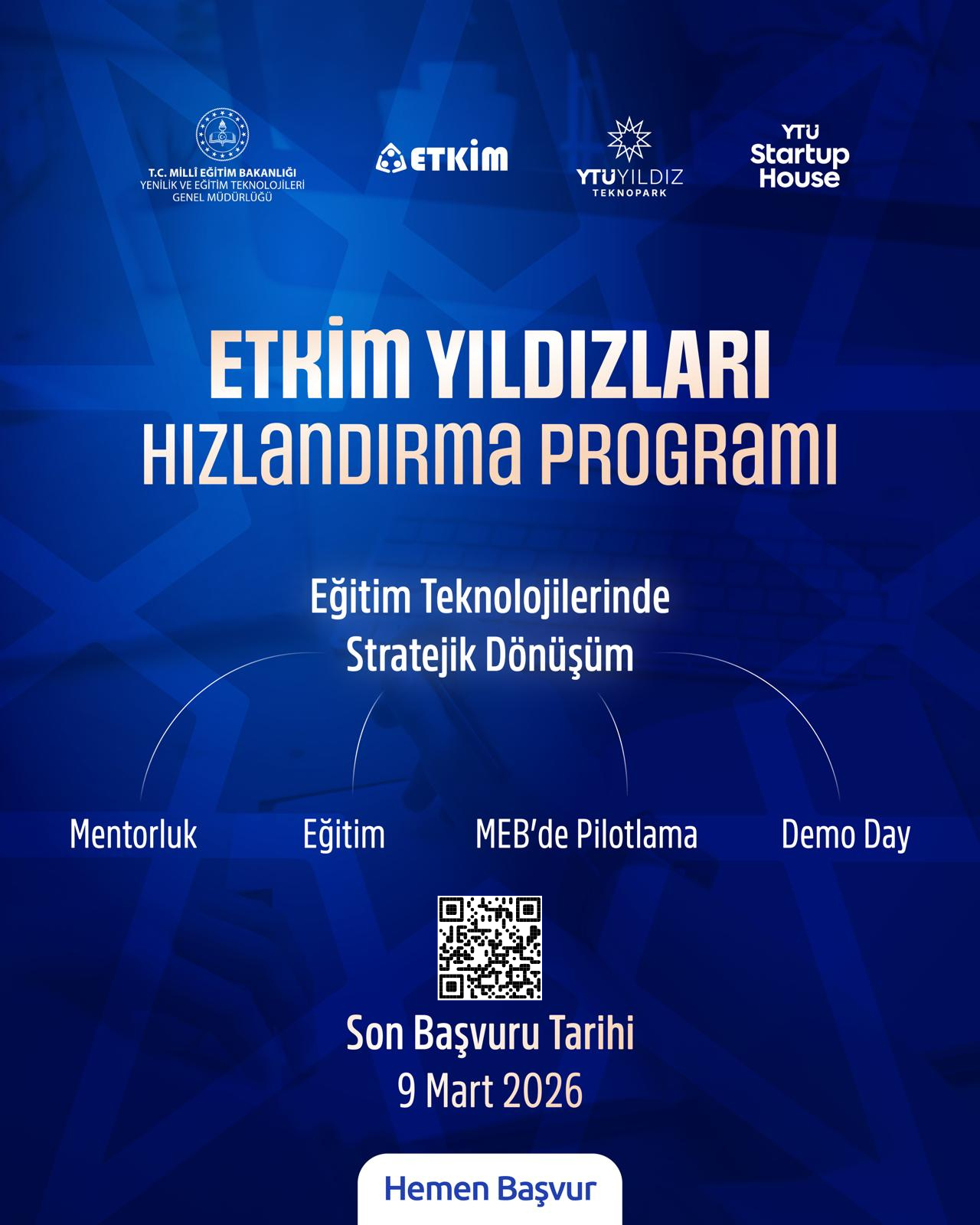 T.C. Millî Eğitim Bakanlığı Yenilik ve Eğitim Teknolojileri Genel Müdürlüğü tarafından, YTÜ Yıldız Teknopark iş birliğiyle yürütülen ETKİM Yıldızları Hızlandırma Programı başvuruları açılmıştır.
