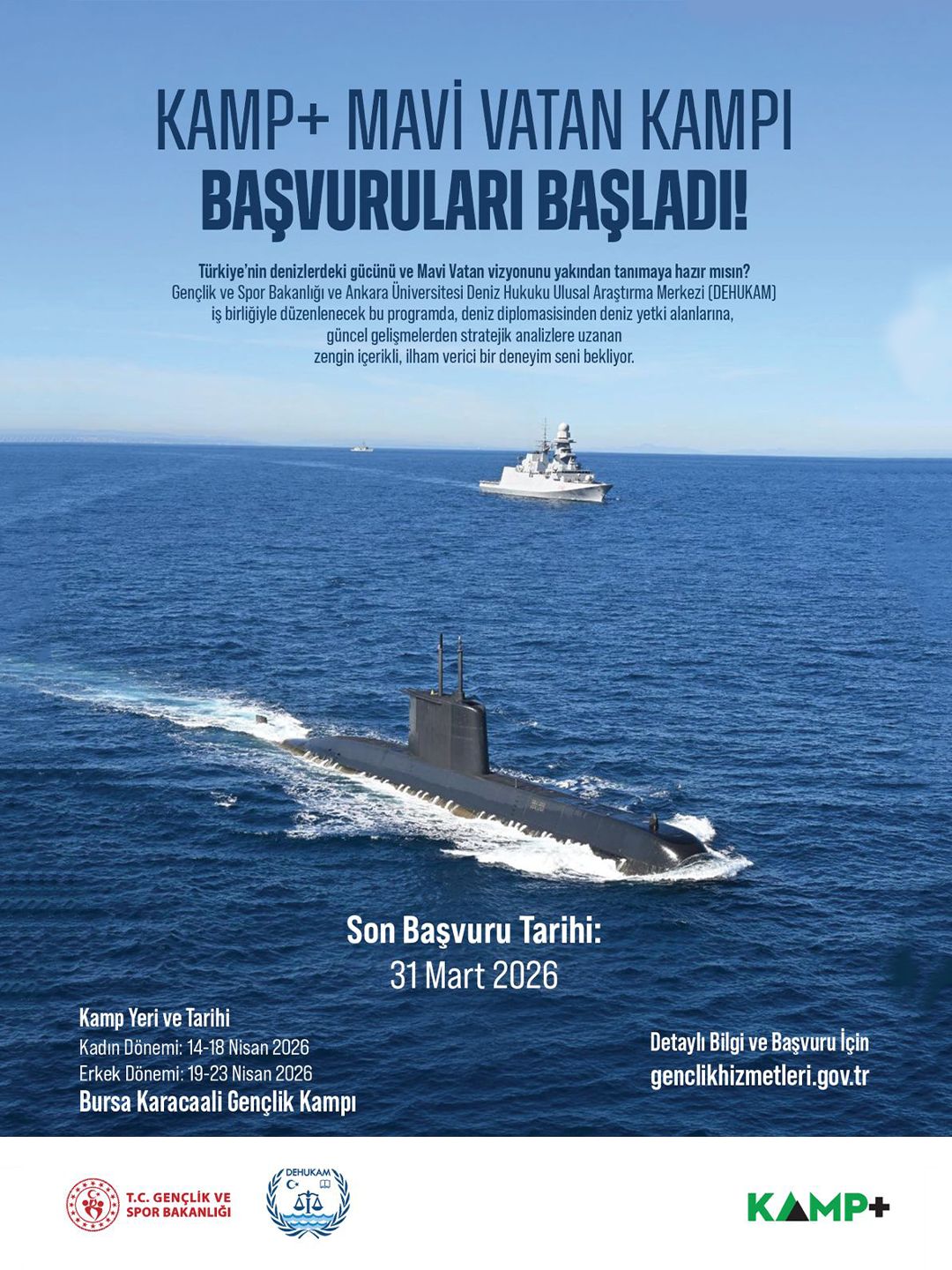Ankara Üniversitesi Deniz Hukuku Ulusal Araştırma Merkezi (DEHUKAM) ile T.C. Gençlik ve Spor Bakanlığı Gençlik Hizmetleri Genel Müdürlüğü iş birliğinde, gençlerin ülkemizin deniz hakları konusunda bilinçlenmesi ve “Mavi Vatan”vizyonunu yakından tanıması amacıyla “KAMP+ Mavi Vatan Kampı” düzenlenecektir.