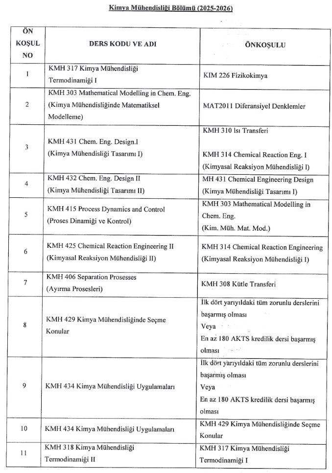 KMH 429 Kimya Mühendisliği Seçme Konular Dersi kapsamında Bitirme Tezi dersini alabilmek için gerekli Koşullar:
